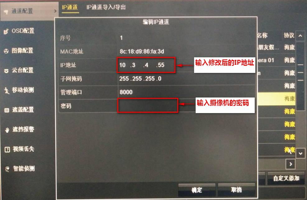 進(jìn)入編輯IP通道的界面,輸入需要修改的攝像機(jī)的IP地址,輸入