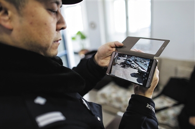 昨日,昌平霍營派出所,社區(qū)民警向記者展示自己手機(jī)上安裝監(jiān)控APP,利用這個APP可以實(shí)時查看自己轄區(qū)的探頭內(nèi)容。新京報記者 彭子洋 攝