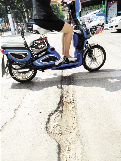 在振興路與吉品街路口西側(cè),有一條“溝壑”穿馬路而過,由于“溝壑”回填得不太好,路面上留有一條深約10厘米,寬約20厘米的溝,不少騎電動車的市民經(jīng)過此處時都顛簸得厲害。“這條溝存在很長一段時間了,也是安裝監(jiān)控時留下的,原先用沙土回填一部分,但是隨著時間的推移,回填的沙土下陷,就出現(xiàn)了現(xiàn)在的這條溝,很不安全,雨天的時候溝里面會積滿污水,車輛經(jīng)過時,污水還會濺到行人身上?!焙咳缡钦f。
