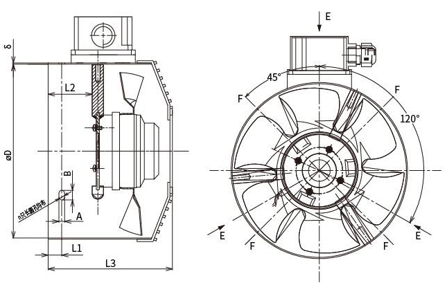 風機所用零部件符合ROHS法規(guī)。在靠墻位置安裝時依然可以有效運行。